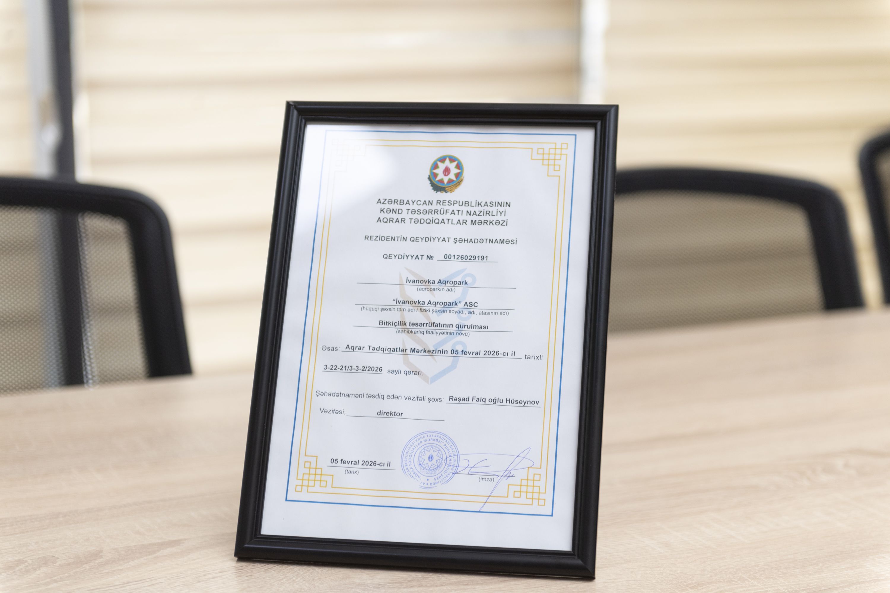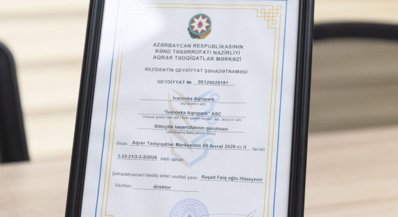 Tədbirin sonunda ATM direktoru Rəşad Hüseynov rezidentin qeydiyyat şəhadətnaməsini “İvanovka Aqropark”ın direktoru Ramin Əlifova təqdim edib.